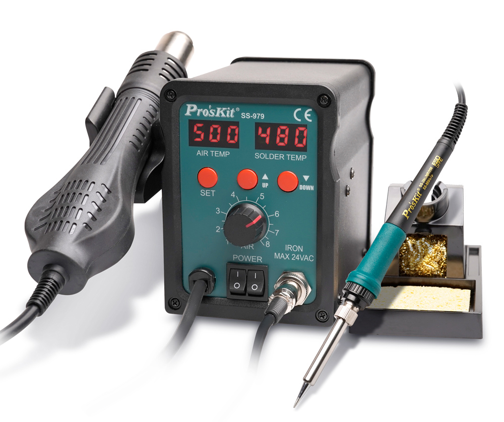 Σταθμός συγκόλλησης 2 σε 1 της PROSKIT με κολλητήρι και πιστόλι θερμού αέρα. Διαθέτει συνολική ισχύ 760W και ρυθμιζόμενη θερμοκρασία από 200 έως 480 °C για την συγκόλληση και 100 έως 500 °C για το πιστόλι θερμού αέρα.