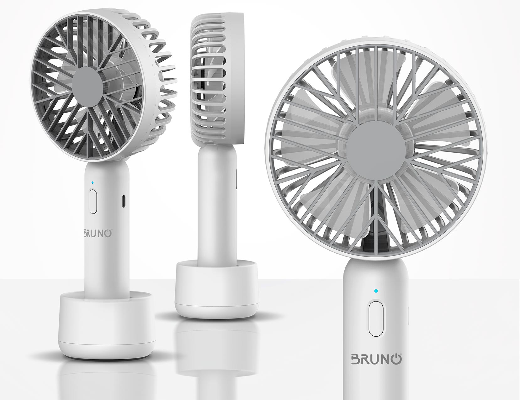 BRUNO φορητός ανεμιστήρας χειρός BRN-0229, επαναφορτιζόμενος, με βάση & λουράκι μεταφοράς, λευκός/γκρι