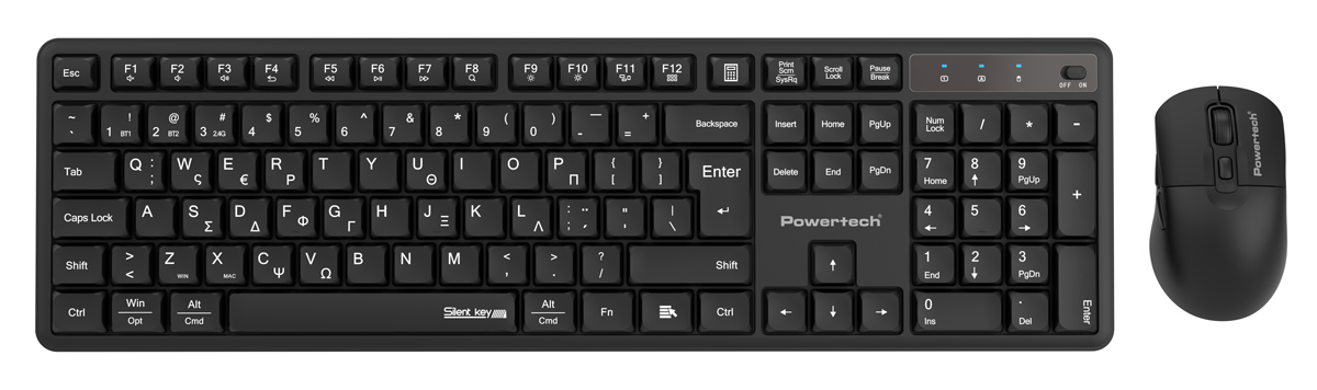 POWERTECH set ασύρματο ποντίκι & πληκτρολόγιο PT-1540, 2.4GHz & Bluetooth, αθόρυβο, μαύρο