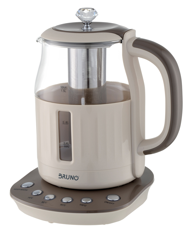 Ηλεκτρικός βραστήρας εξαιρετικής απόδοσης της BRUNO με ισχύ 2200W και χωρητικότητα 1,5 lt. Διαθέτει 4 επίπεδα ρύθμισης θερμοκρασίας, με λειτουργία διατήρησης της θερμοκρασίας αλλά και σύστημα ασφαλείας κατά του βρασμού χωρίς νερό. Επιπλέον είναι εξοπλισμένος με φίλτρο για τσάι ή άλλα ροφήματα.
