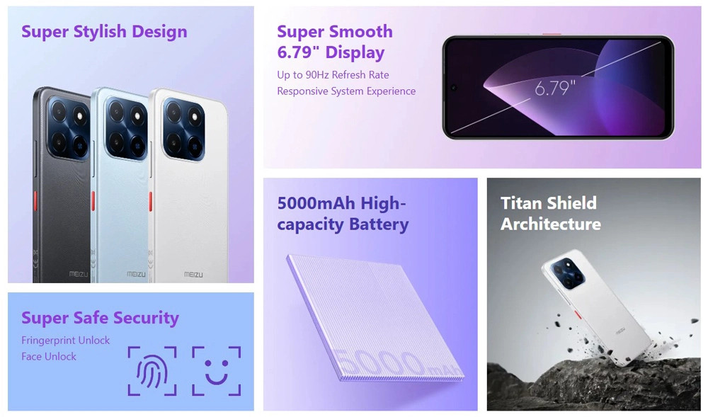 Μοντέρνο και όμορφο smartphone Mblu 22 της MEIZU με μεγάλη οθόνη 6.79", οκταπύρηνο επεξεργαστή και λειτουργικό Android 15.