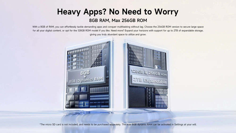 Με 8GB (+8GB virtual) RAM και 256GB ROM για να αποθηκεύετε τα αγαπημένα σας αρχεία, φωτογραφίες και βίντεο. Επιπλέον, προσφέρει την δυνατότητα να επεκτείνετε τον χώρο αποθήκευσης του tablet με κάρτα micro SD έως 2TB.